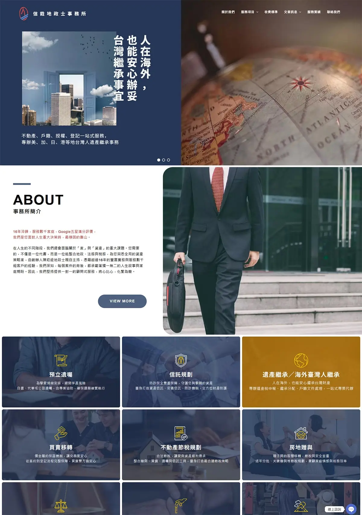 以地政士事務所的專業形象為核心,延續品牌商標的藍色調,象徵法律的嚴謹、公正與理性,深色基底強化信賴感與穩定度,使整體視覺更具權威性,為了在穩重基礎中展現更貼近人心的一面,以交錯的方塊與文字拼貼作為主要的版面語彙,透過清晰節奏與留白,營造年輕、富活力且易於理解的資訊動線,減少專業內容的距離感。其間點綴的黃色元素象徵「希望與指引」,讓訪客在面對土地、法律與權益等複雜議題時,看見前進的光亮。整體設計旨在兼具專業、親和與信任,勾勒出地政服務應有的溫度與可靠性。